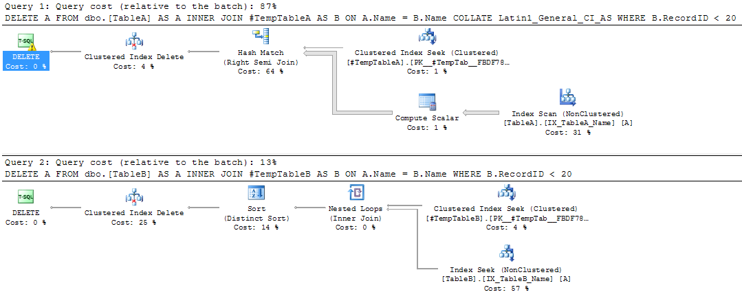 DELETE A FROM dbo.[TableA] AS A INNER JOIN #TempTableA AS B ON A.Name = B.Name COLLATE Latin1_General_CI_AS WHERE B.RecordID < 20; GO DELETE A FROM dbo.[TableB] AS A INNER JOIN #TempTableB AS B ON A.Name = B.Name WHERE B.RecordID < 20; GO
