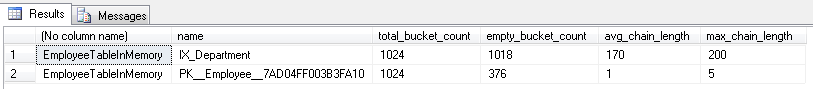 N.B. – I’ve created two hash indexes here. One as a primary key on EmployeeID and one as a nonclustered index on Department, just so that you can see the difference in syntax.