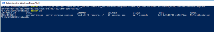 docker run -d -p 15789:1433 --env ACCEPT_EULA=Y ––env sa_password=Testing11@@ --name MyFirstContainer microsoft/mssql-server-windows-express