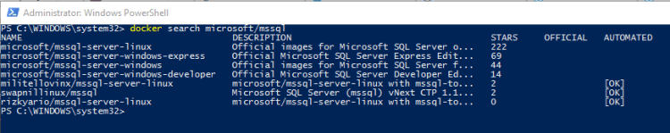 Now it’s time to build a container that’s running SQL Server 2016 (I’m going to use the SQL 2016 Express Edition image for this demo). Docker requires images to build containers so first thing is to get the image: –