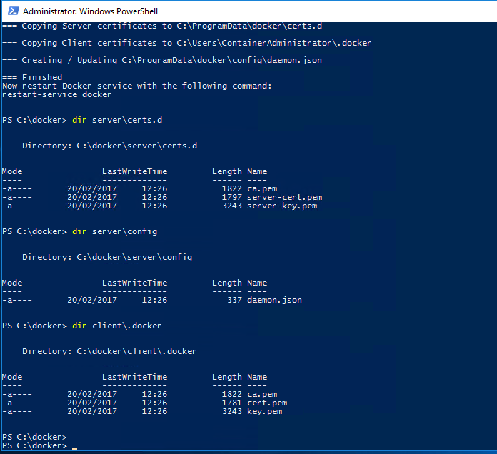 mkdir C:\ProgramData\docker\certs.d copy-item C:\docker\server\certs.d\ca.pem C:\ProgramData\docker\certs.d copy-item C:\docker\server\certs.d\server-cert.pem C:\ProgramData\docker\certs.d copy-item C:\docker\server\certs.d\server-key.pem C:\ProgramData\docker\certs.d copy-item C:\docker\server\config\daemon.json C:\ProgramData\docker\config