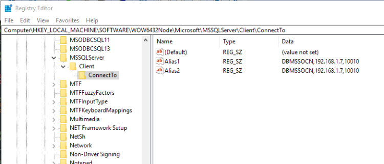 Obviously we wrapped the script up in a load of try…catch blocks to make sure that if the keys were already there then it would drop & re-create but the core of what it does is above. What the script above will do is create two aliases that map to server 192.168.1.7 on port 10010: –
