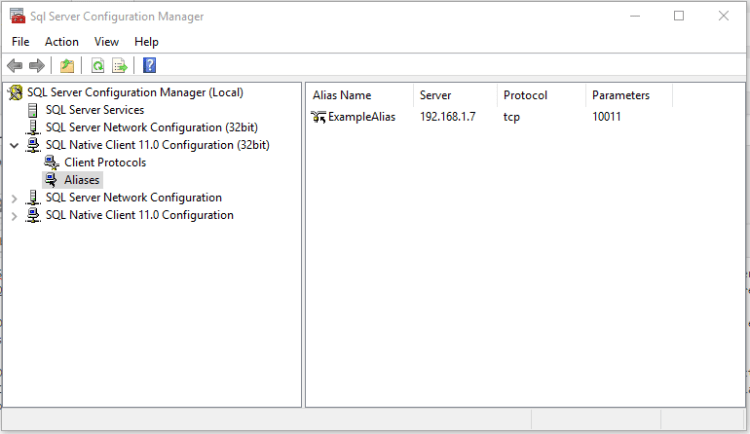 Setting up aliases is simple enough if you have the SQL configuration manager installed. Simply navigate down to the SQL Native Client section within the config manager, right click and fill out the name, server IP and port number: –