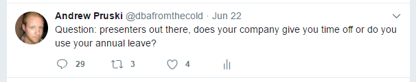I was interested to see the responses as I wanted to know how more experienced presenters get the time off to speak at so many events. Up until now I’ve been using annual leave and this was a way of gauging what was the general standard out there.