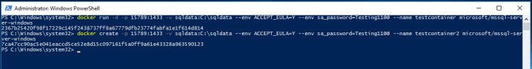 docker create -p 15789:1433 -v sqldata:C\sqldata --env ACCEPT_EULA=Y --env sa_password=Testing11@@ --name testcontainer2 microsoft/mssql-server-windows