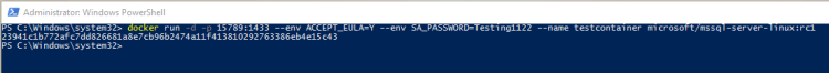 docker run -d -p 15789:1433 --env ACCEPT_EULA=Y --env SA_PASSWORD=Testing1122 --name testcontainer microsoft/mssql-server-linux:rc1