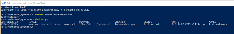 Cool, the container is up and running! Connecting locally is different than connecting to a SQL instance in a Windows container. With Windows containers I would use the docker inspect command to find the private IP address assigned to the container and use that to connect via SSMS.
