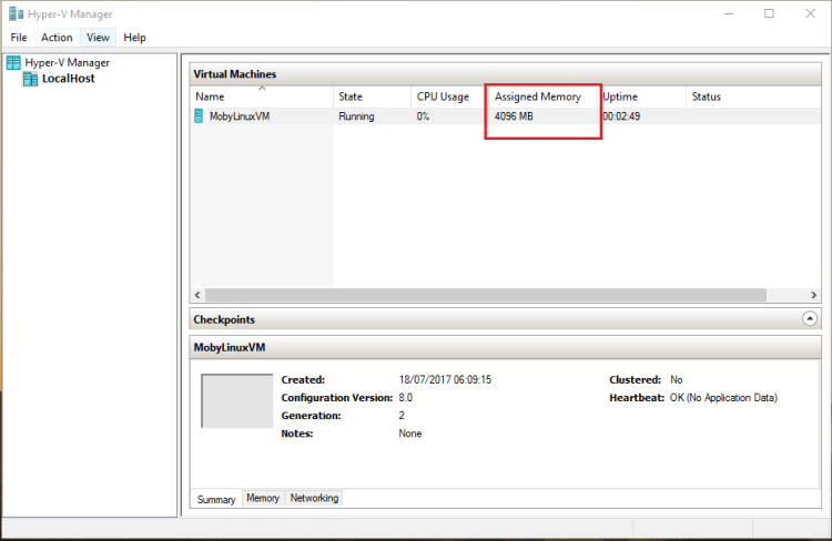 The Docker Engine will restart to apply the changes, which can be confirmed in Hyper-V Manager: –