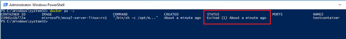 Cool, the container is up and running! Connecting locally is different than connecting to a SQL instance in a Windows container. With Windows containers I would use the docker inspect command to find the private IP address assigned to the container and use that to connect via SSMS.