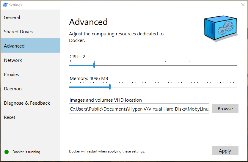 Don’t adjust the memory allocation in Hyper-V Manager however, the changes won’t persist. Instead right-click on the Docker icon in the Taskbar and choose Settings then Advanced: –