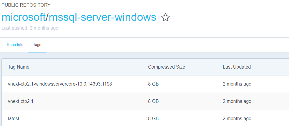 Microsoft have announced the availability of SQL Server 2017 RC1 and I wanted to check it out in a container however it seems that the Windows image hasn’t been updated on the Docker Hub: –