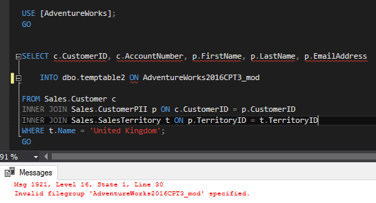 Now I can run the SELECT…INTO statement using the new ON FILEGROUP option. I’m going to run an example SELECT statement to capture Sales in the UK: –