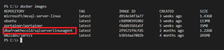 What this has done is create a repository called sqlserverlinuxagent with our image tagged underneath it. To see the image run: –