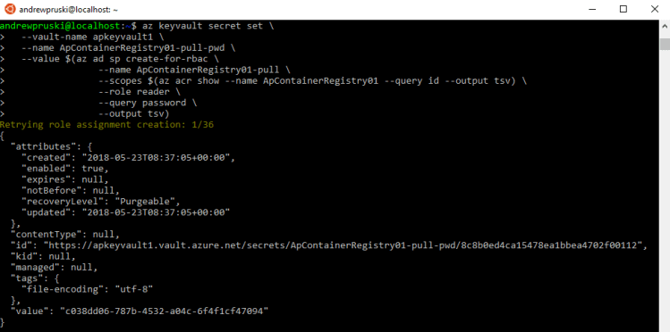 Then we grab the service principal’s appId which will be the username passed to the Azure Container Registry: –