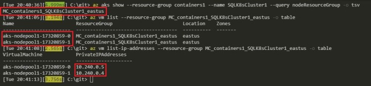 Resources for an AKS cluster are created in a separate resource group (for….reasons). To get that resource group name run: –
