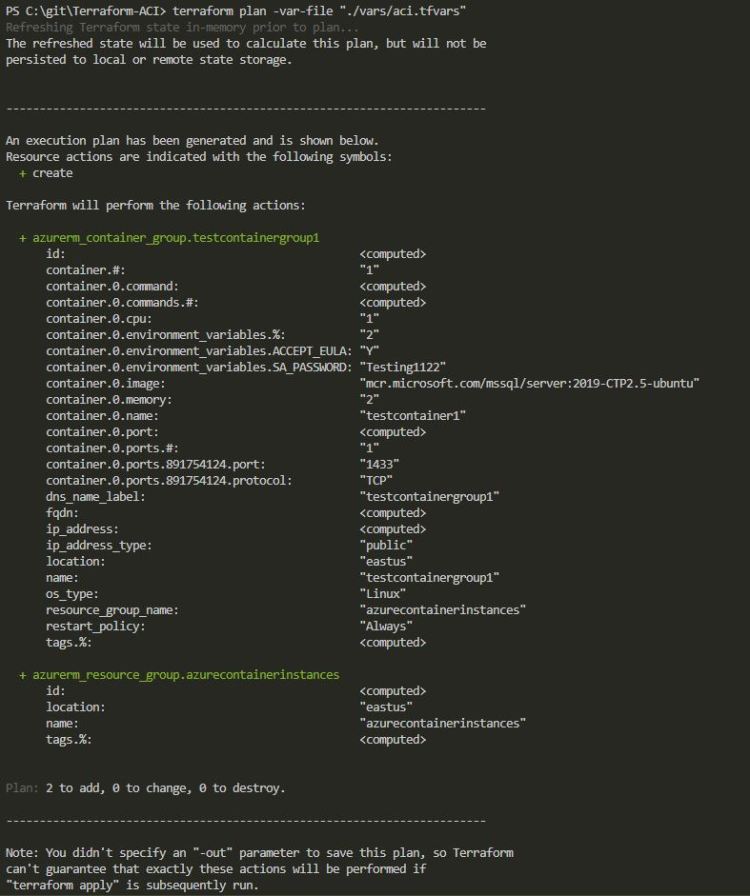 Now we can test the deployment (notice we’re referencing the aci.tfvars file): –