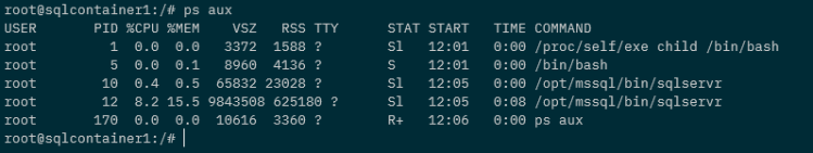 Cool! We have a couple of SQL processes running! And because the container is in a process id namespace…it can only see its own processes.