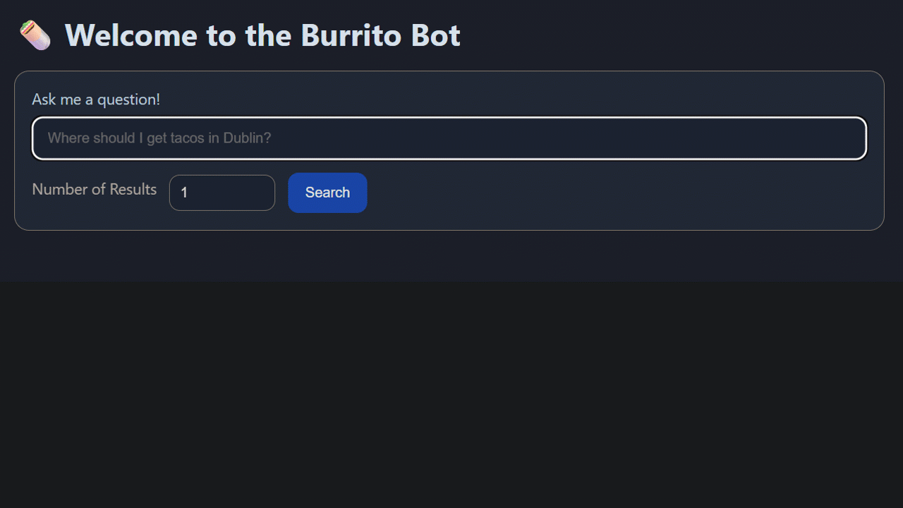 OK, we are pretty much done! All the functionality is there to perform semantic similarity searching over restaurant review data. All we need is a front end, which is a web application built in Azure with python. I’m not going to post the whole script here (this post is long enough and I want it to focus on the SQL Server functionality) but it’s available in the azure-web-app branch of the Burrito-Bot github repository.