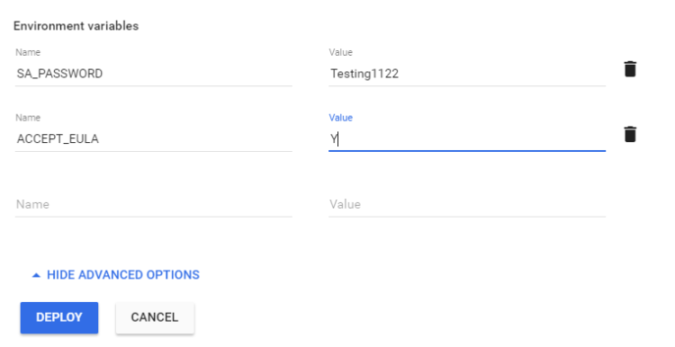 At a minimum variables for ACCEPT_EULA (otherwise the container will not run) and SA_PASSWORD (otherwise you will not be able to connect to SQL Server) need to be specified: –