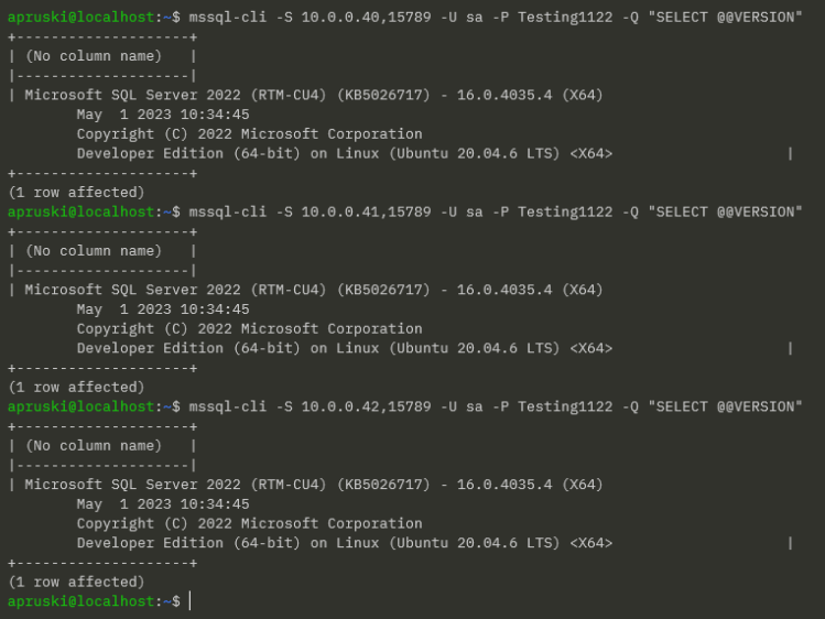 mssql-cli -S 10.0.0.40,15789 -U sa -P Testing1122 -Q "SELECT @@VERSION"