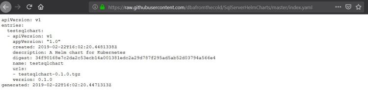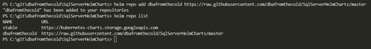 helm repo add dbafromthecold https://raw.githubusercontent.com/dbafromthecold/SqlServerHelmCharts/master