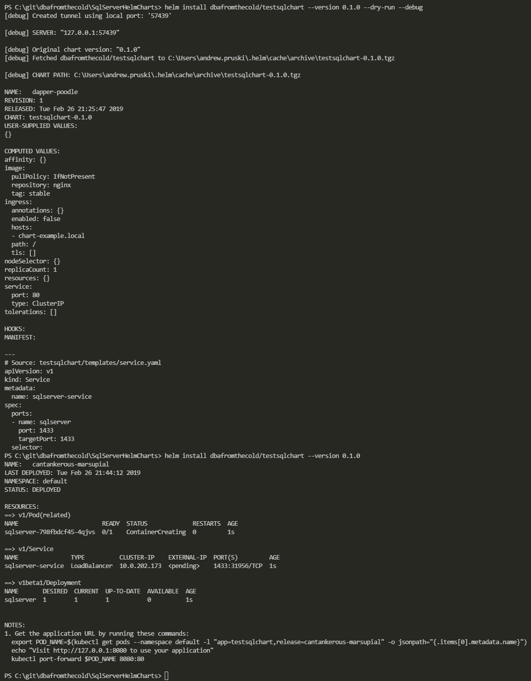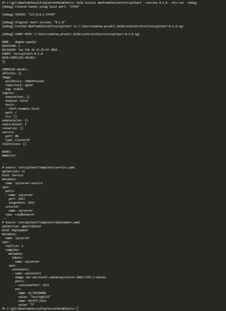helm install dbafromthecold/testsqlchart --version 0.1.0 --dry-run --debug
