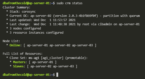 Now we can see that all the resources (barring the fencing resource which has moved to ap-server-01) are on the new primary! Manual failover complete!
