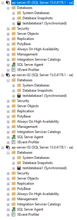Once that’s complete we should see the database on all three servers in the cluster: –