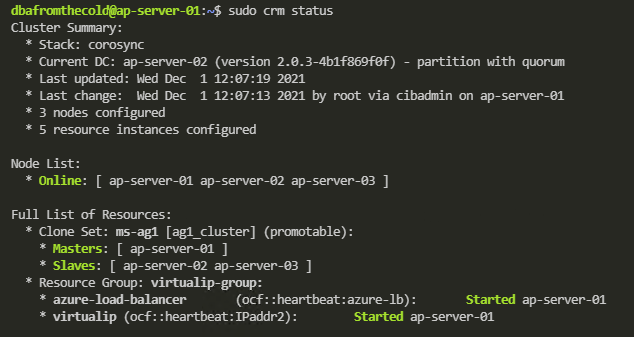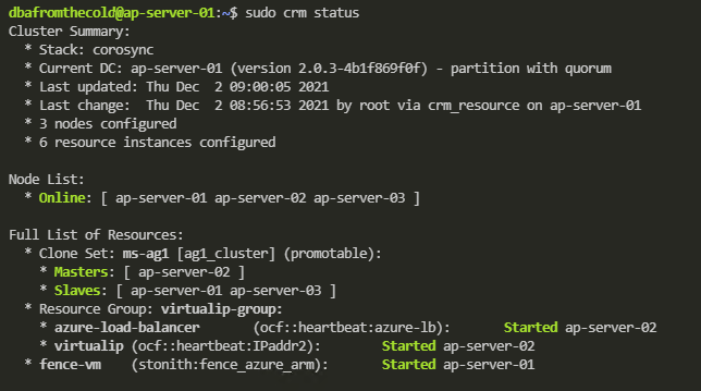 And that’s it! We have successfully deployed an availability group to a pacemaker cluster in Azure and tested a manual failover.