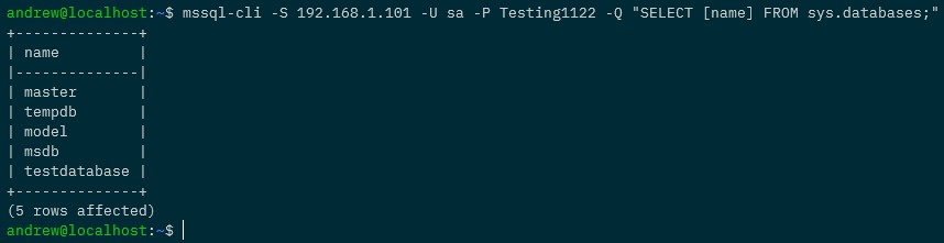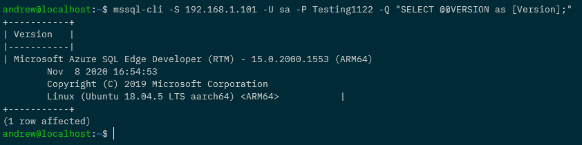 mssql-cli -S 192.168.1.101 -U sa -P Testing1122 -Q "SELECT @@VERSION as [Version];"