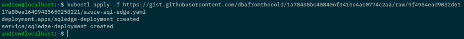 kubectl apply -f https://gist.githubusercontent.com/dbafromthecold/1a78438bc408406f341be4ac0774c2aa/raw/9f4984ead9032d6117a80ee16409485650258221/azure-sql-edge.yaml