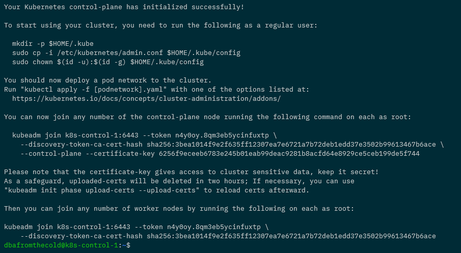 Remember when we ran kubeadm init on the control node to create the cluster? At the end of the output there was something similar to: –