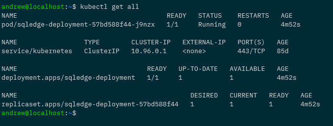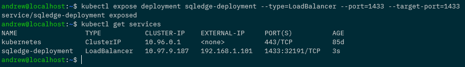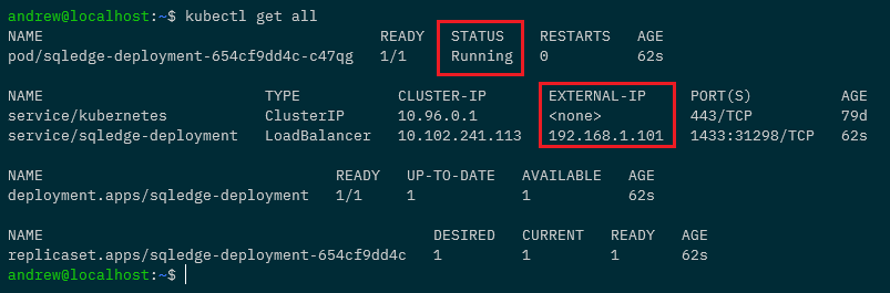 What this is going to do is create a deployment called sqledge-deployment with one pod running Azure SQL Edge and expose it with a load balanced service.