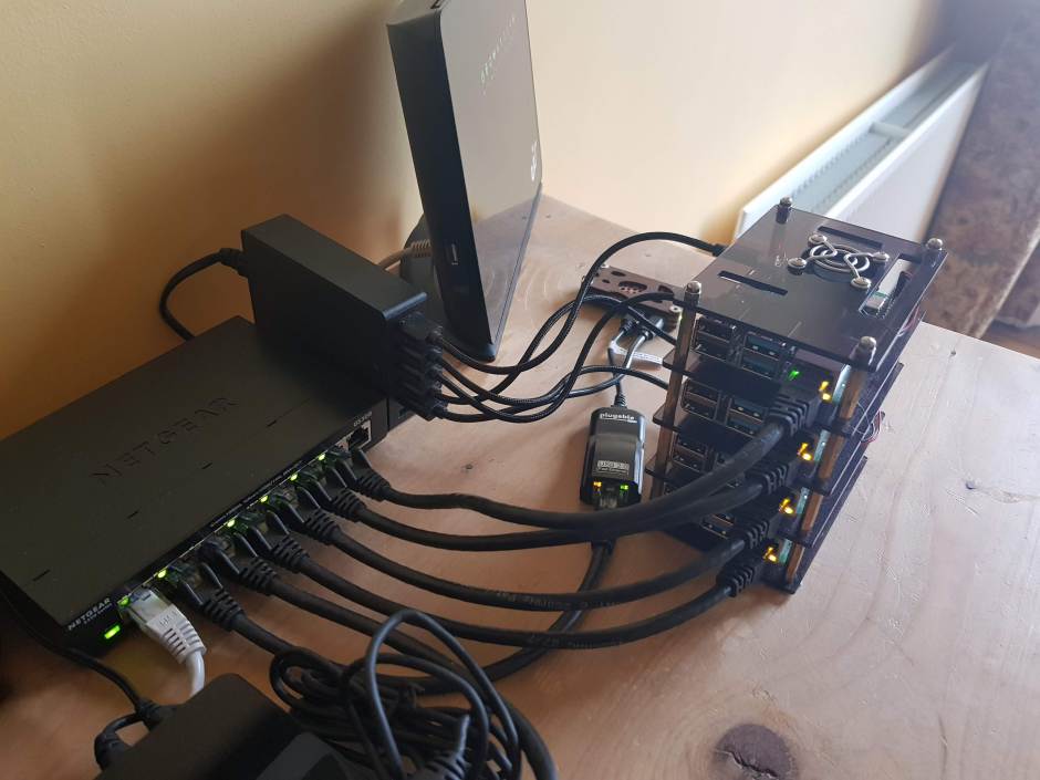 Plug all the SD cards into the Pis. Connect the USB hub to the mains and then plug the switch into your router. It’s plug and play so no need to mess around.