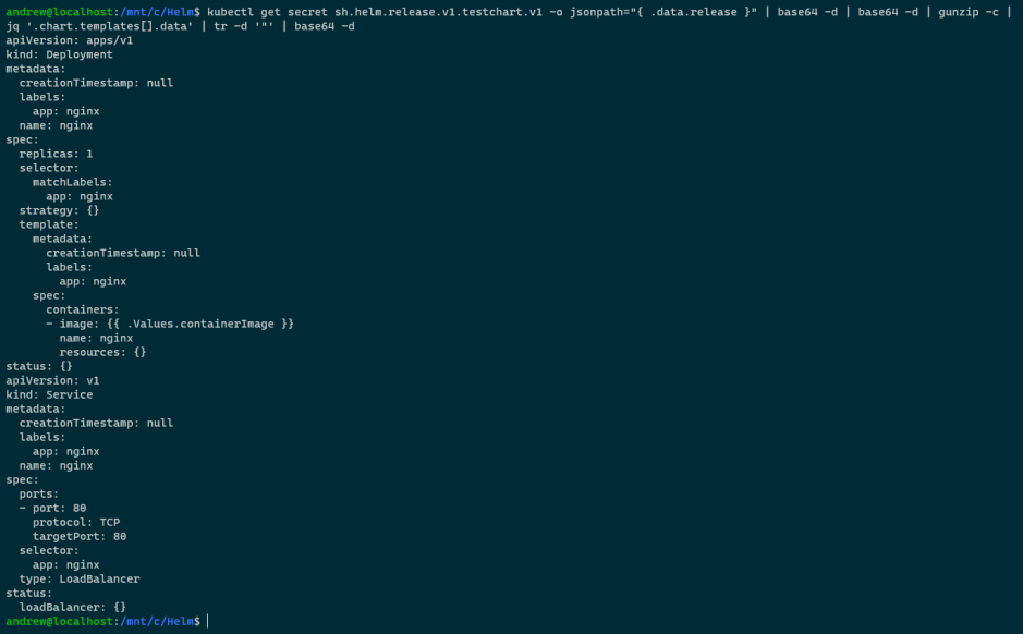 BOOM! That look like our deployment and service manifests! We can see all the information contained in our initial Helm release (confirmed as the container image is nginx:1.17)!