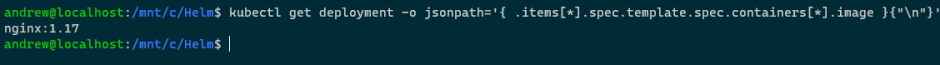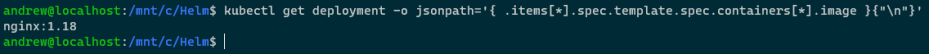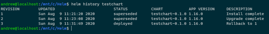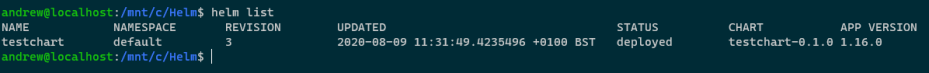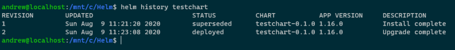 So we can see the initial deployment of the release and then the upgrade. App version remains the same as I haven’t changed the value in the Chart.yaml file. However, the image has been changed and we can see that with: –