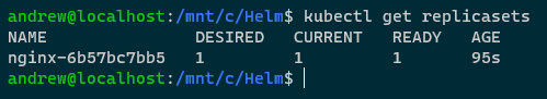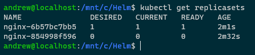 So we have two replicasets for the deployment created by our Helm release. The inital one running nginx v1.17 and the newest one running nginx v1.18.