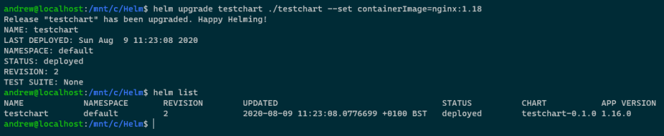 helm upgrade testchart ./testchart --set containerImage=nginx:1.18