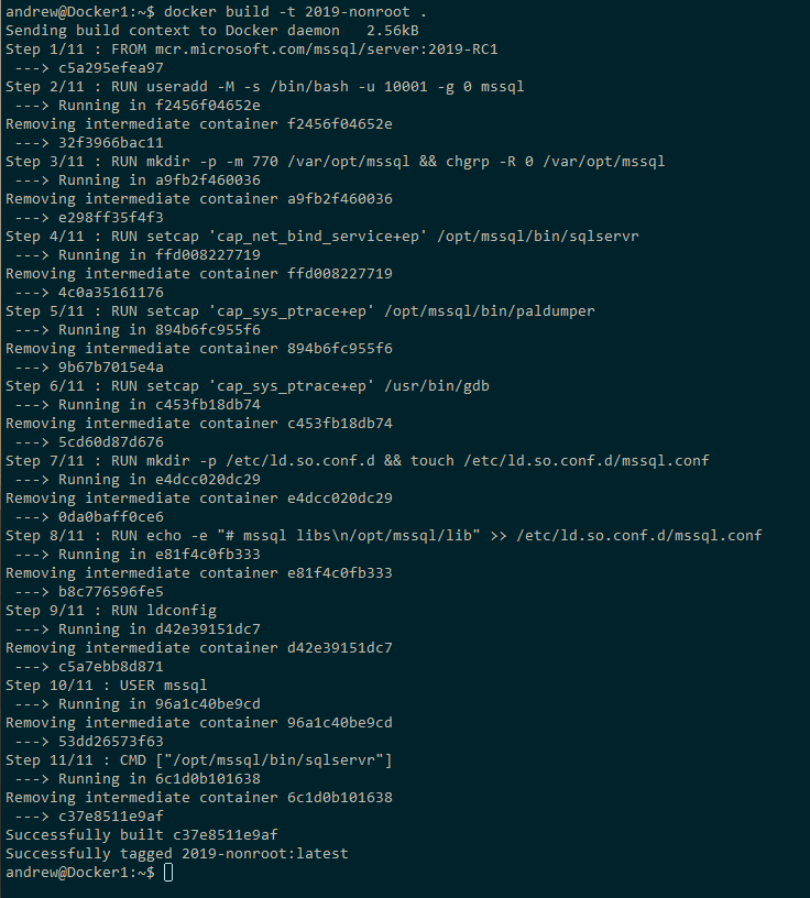 Let’s fix this by running SQL Server 2019 in a non-root container. First thing to do is create a mssql user on the host (you’ll have to run this as a user with sudo rights): –