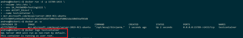 docker run -d -p 15789:1433 \ --volume /etc:/etc \ --env SA_PASSWORD=Testing1122 \ --env ACCEPT_EULA=Y \ --name testcontainer \ mcr.microsoft.com/mssql/server:2019-RC1-ubuntu