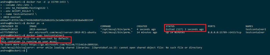 docker run -d -p 15799:1433 \ --volume /etc:/etc \ --env SA_PASSWORD=Testing1122 \ --env ACCEPT_EULA=Y \ --name testcontainer2 \ 2019-nonroot