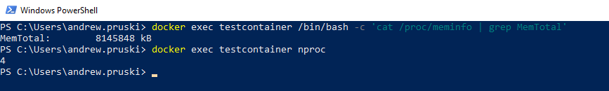 docker exec testcontainer /bin/bash -c 'cat /proc/meminfo | grep MemTotal' docker exec testcontainer nproc
