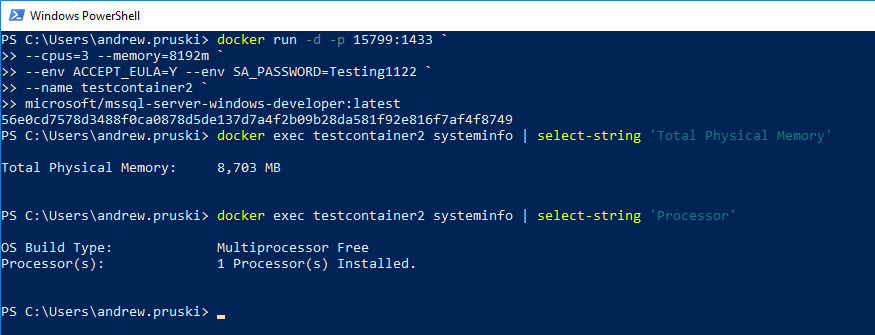 docker exec testcontainer2 systeminfo | select-string 'Total Physical Memory' docker exec testcontainer2 systeminfo | select-string 'Processor'