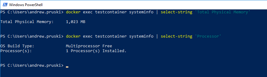 docker exec testcontainer systeminfo | select-string 'Total Physical Memory' docker exec testcontainer systeminfo | select-string 'Processor'
