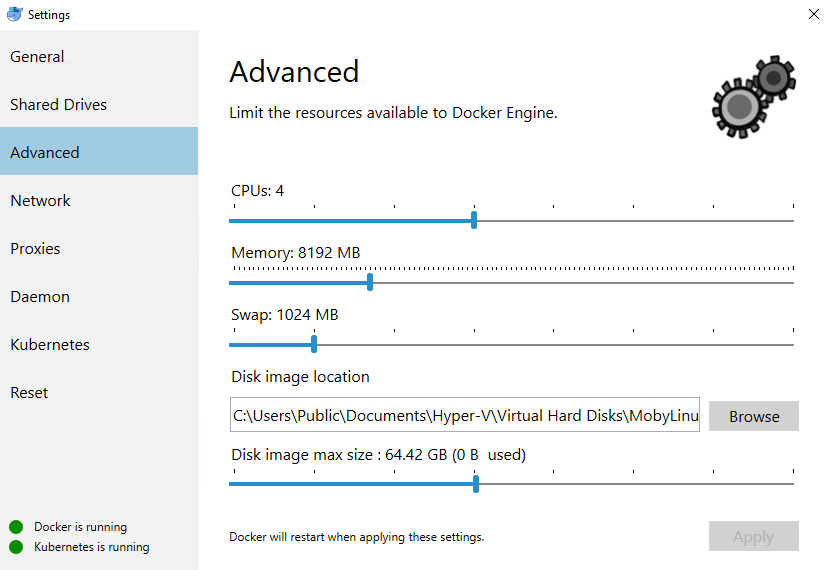 These setting control the resources available to the MobyLinuxVM, where the Linux containers run (and that’s how you get Linux containers running on Windows 10): –
