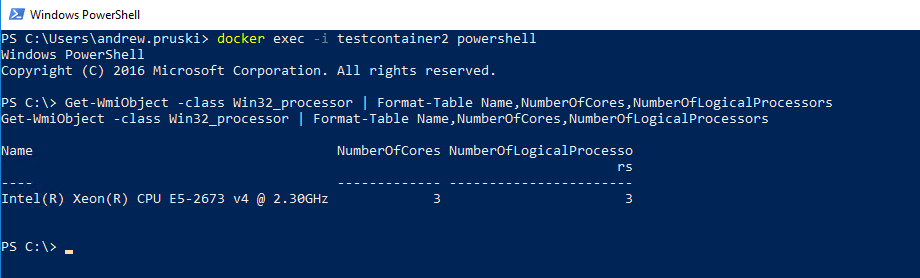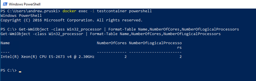 docker exec -i testcontainer powershell Get-WmiObject -class Win32_processor | Format-Table Name,NumberOfCores,NumberOfLogicalProcessors