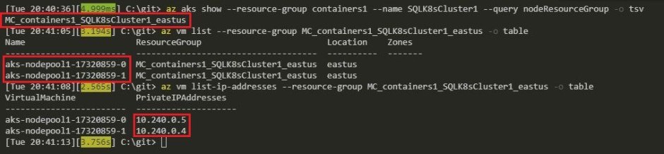 Then grab the nodes in the cluster (RESOURCEGROUPNAME2 is the output of the above command): –