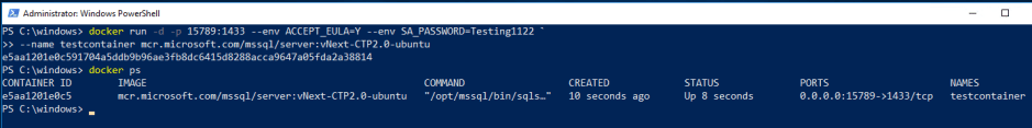 --env ACCEPT_EULA=Y --env SA_PASSWORD=Testing1122 `