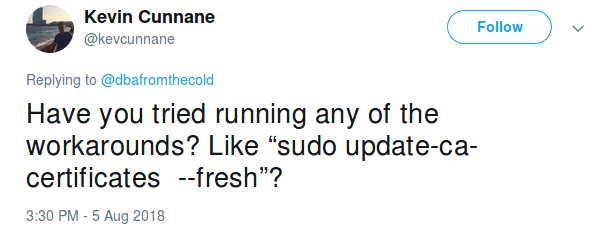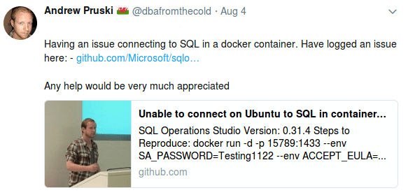 And to be honest, so far so good! The machine itself is absolutely fantastic and apart from one issue now resolved, Ubuntu has been great to use. I used it to present my partitioning session at the Dublin User Group this week and all went well. Using SQL in a docker container and SQL Operations Studio, my demos worked no problem.