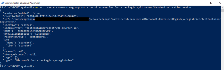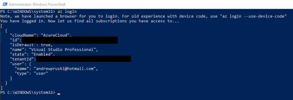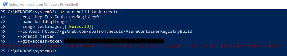 I’ve played around a bit but couldn’t get it to work, so I cut my losses and jumped into bash. Probably shouldn’t be running the Azure-CLI commands in a powershell window but I needed to previously as I had to build a docker image locally, we don’t need to do that now.